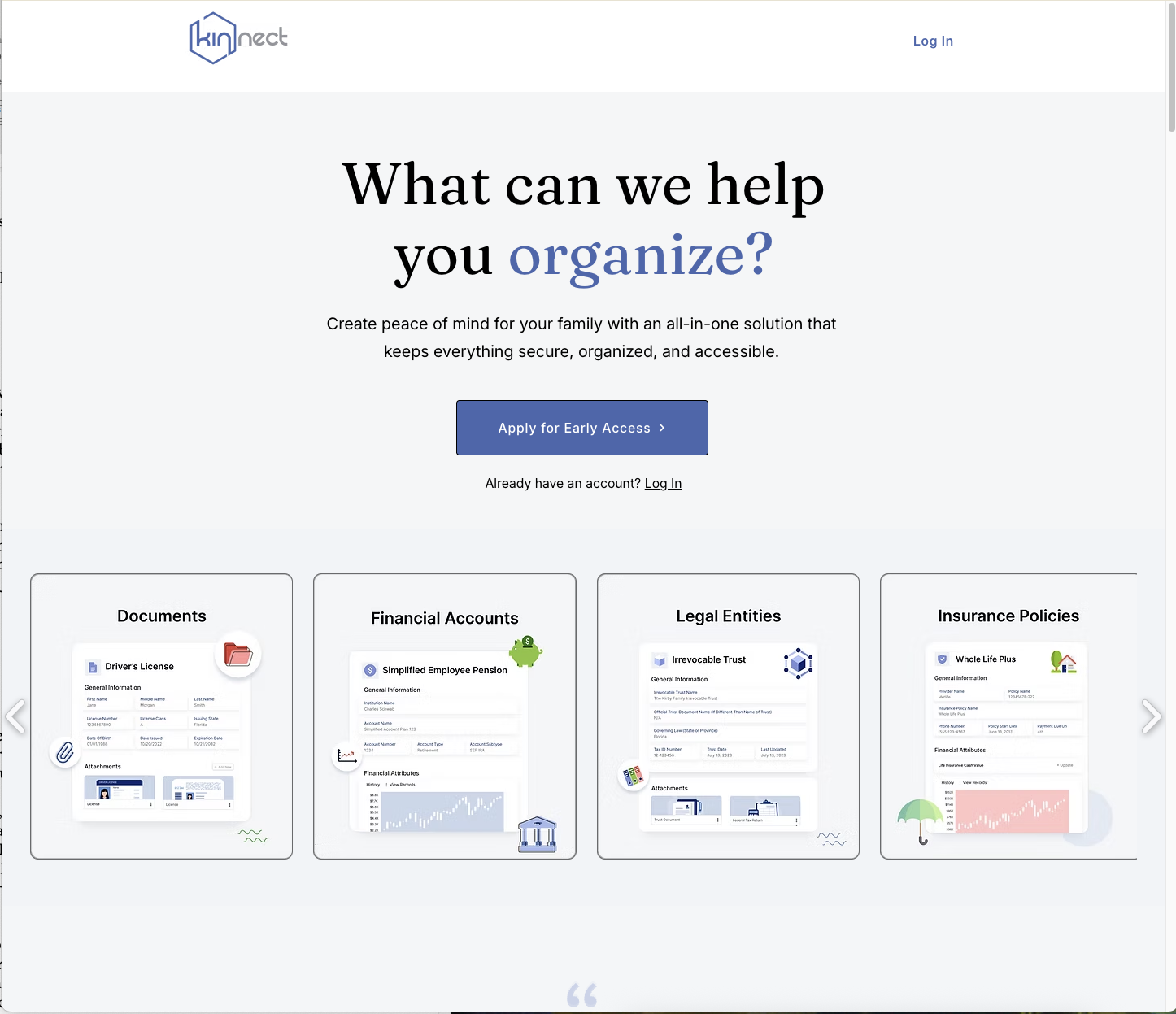 Create peace of mind for your family with an all-in-one solution that keeps everything secure, organized, and accessible. Kinnect helps families stay synchronized through AI Powered Document Management, Object-Based Data Templates, Collaborative Vaulting, Controlled data sharing, and Checklists & Single Click Reminders. Bringing order to chaos and preparing your family for the future.